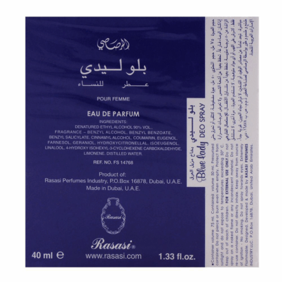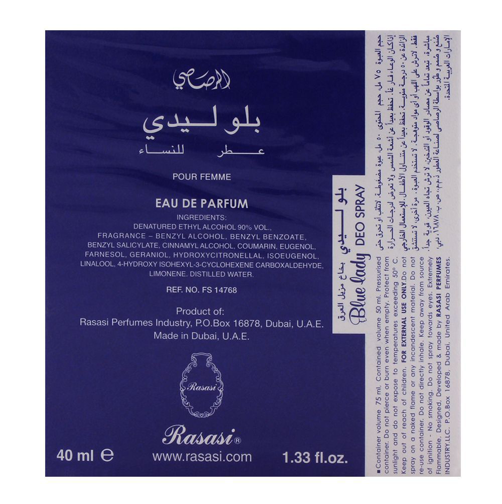 Blue Lady by Rasasi is a Floral Woody Musk fragrance for women. Top notes are Tuberose, Ylang-Ylang, African Orange Flower and Violet Leaf;
